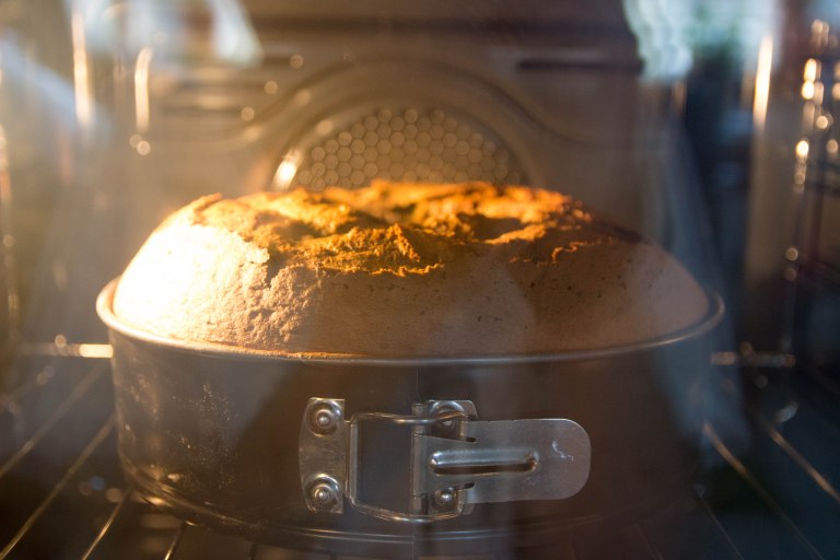 Step 5: Carefully pour the batter into the tube pan. Gently tap the pan on a counter to level the contents and smooth the top of the batter. Place the cake in the oven and bake for about 1 hour, or until a knife inserted into the cake comes out clean.