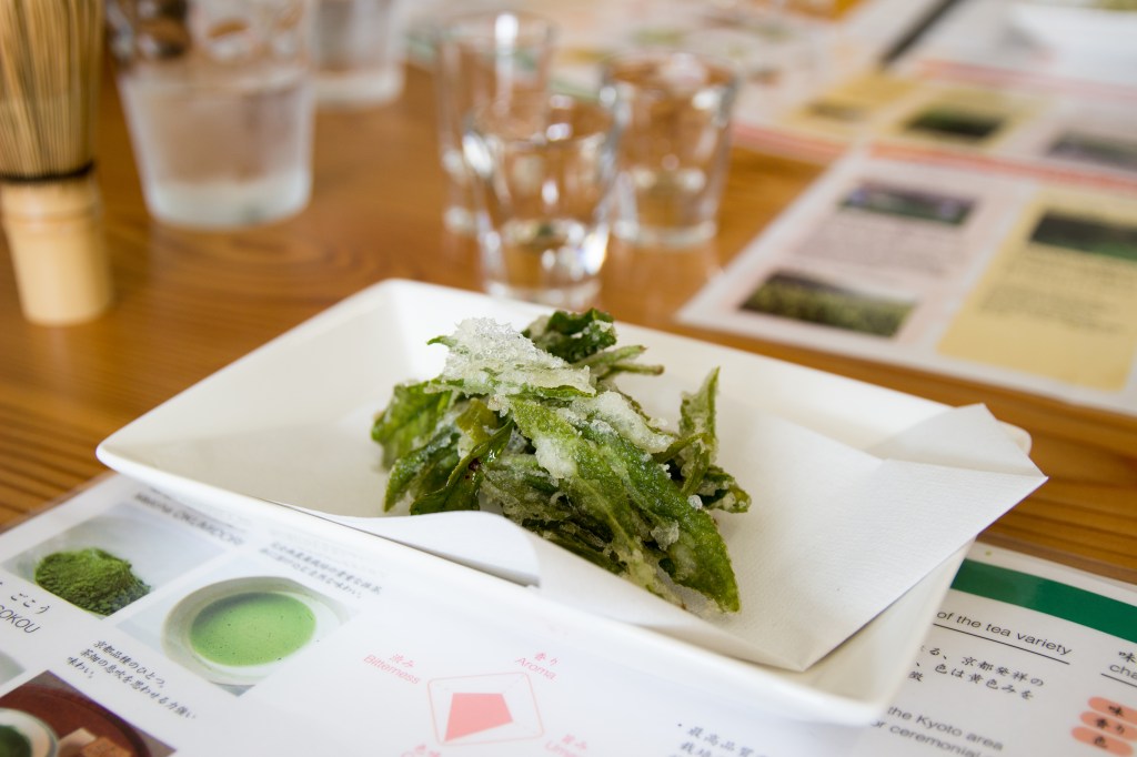 Then came time for the next exciting part of Daiki’s tour – picking tea leaves! We were carefully searching and picking the most beautiful leaves off camellia sinensis bushes harvested by Daiki’s family and colleagues. The purpose was to carry these tea leaves back to Daiki’s cafe-shop and try them as green tea tempura. Whaaaaaaat? Yes, here is some crispy green tea leaves on your plate, bon appetit!